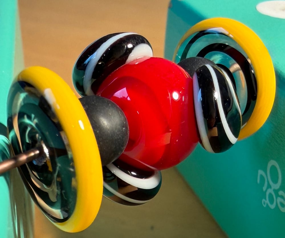 This group feels very retro to me. The focal beads is about 3/4", the spirals are 1/2". The spacer beads are Czech Druk beads with a matte finish.