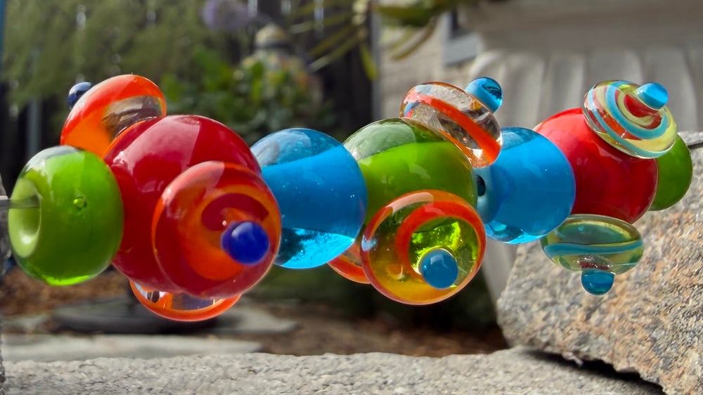 The three larger beads with the "marbles" on the outside are about 3/4" with the marbles spaced off center...with intent. :). 3/32" holes. The blue spaces have 3/32" holes, the lime have 1/8" holes.