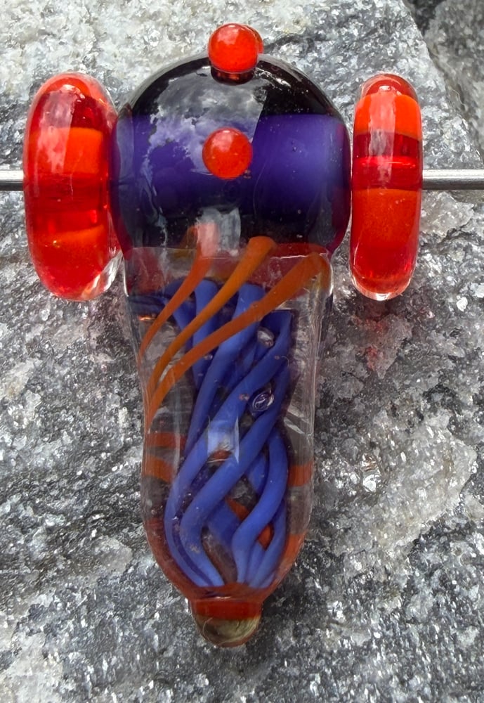 Pendant-style bead made with my twisted cane. 1/ 1/4' X 5/8". The striped spacer beads are 1/2". All the beads have 3/32" holes.