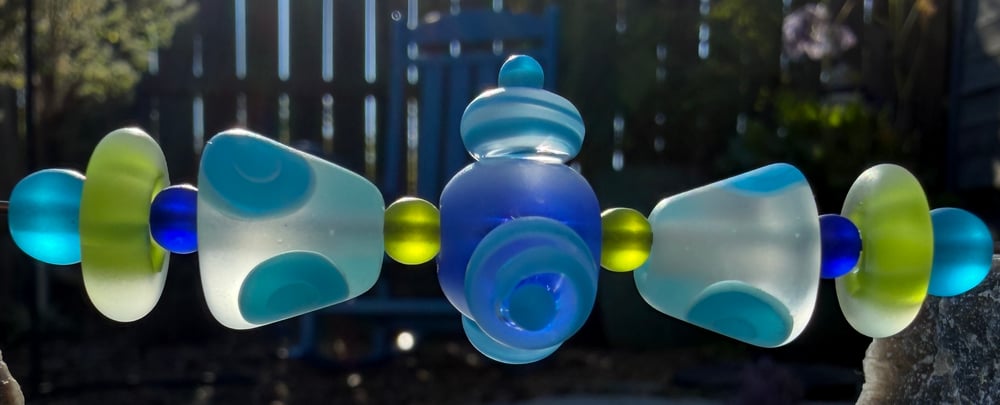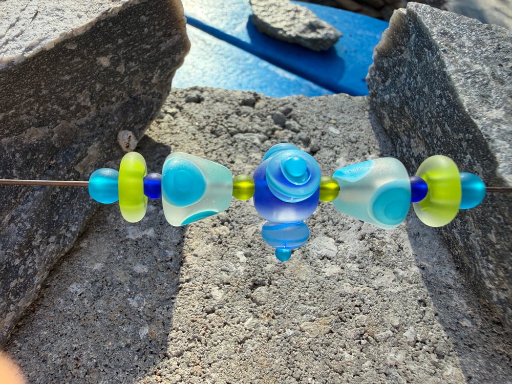 Beachy, tumbled beads including a Sputnik, a pair of cones, and a pair of stripes.
